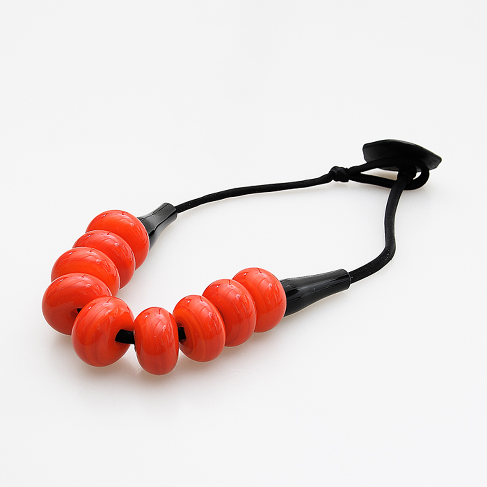 Collana realizzata con perle in vetro di Murano, soffiate a bocca e modellate a caldo da abili artigiani veneziani, in modo da risultare leggermente schiacciate e due coni sempre in vetro nero fatti a mano nella parte terminale.