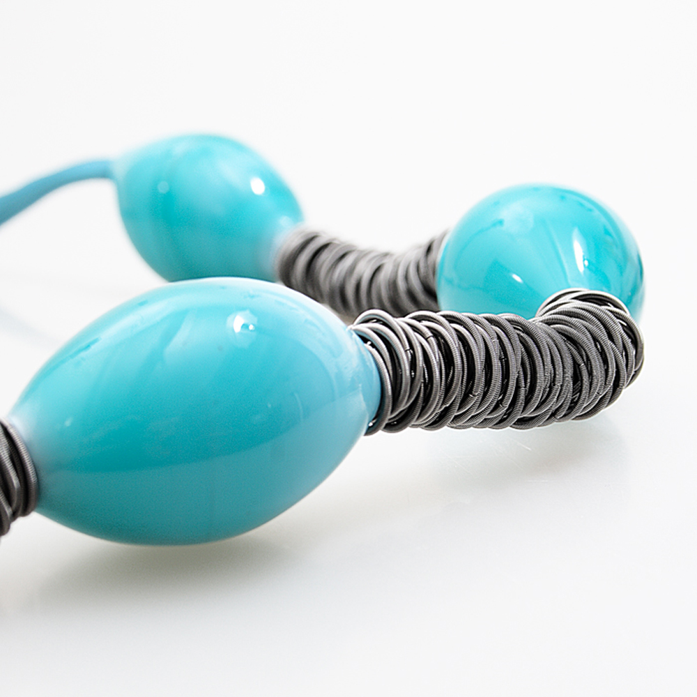 Collana realizzata con cinque perle in vetro di Murano soffiate a bocca e modellate a mano da esperti artigiani veneziani per ottenere una forma ovoidale. Come distanziatori sono usati degli anellini in molla di acciaio totalmente anallergici.