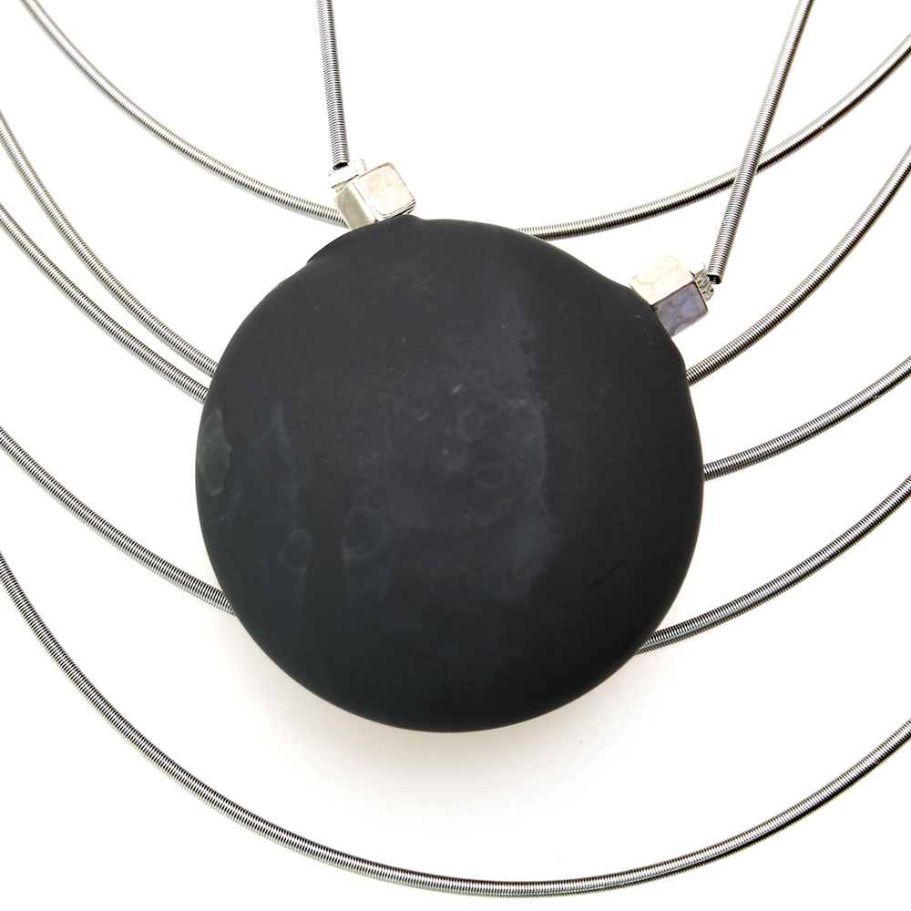 Il contrasto tra i morbidi giri d’acciaio con la perla di vetro soffiato è di grande effetto.