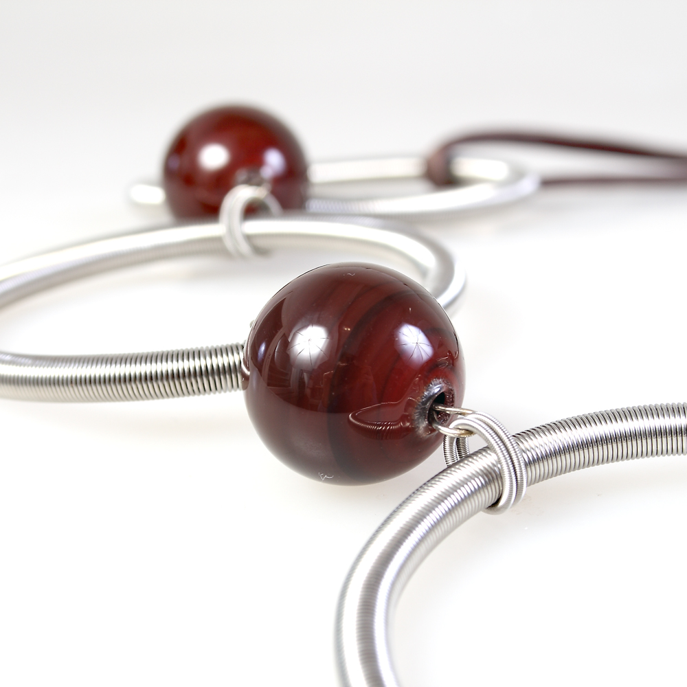 Collana composta da quattro sfere in vetro di Murano soffiate a bocca e lavorate a caldo in più colori sovrapposti. Le molle sono in acciaio e il tessuto in raso.